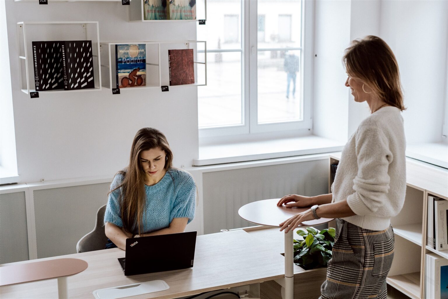 Nowocześnie umeblowane, jasne wnętrze z regałami na książki. Kobiety siedzą w fotelach