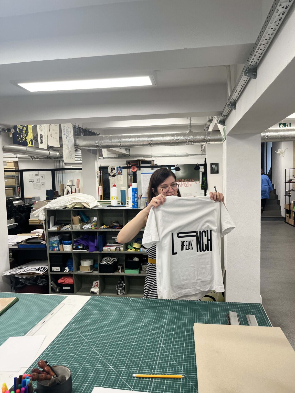 Zadanie polega na zaprojektowaniu prostego przekazu (maksymalnie jednego zdania), złożeniu składu typograficznego (z dostępnych w studio drewnianych czcionek) i odbiciu na T-shirtach przy pomocy prasy typograficznej.