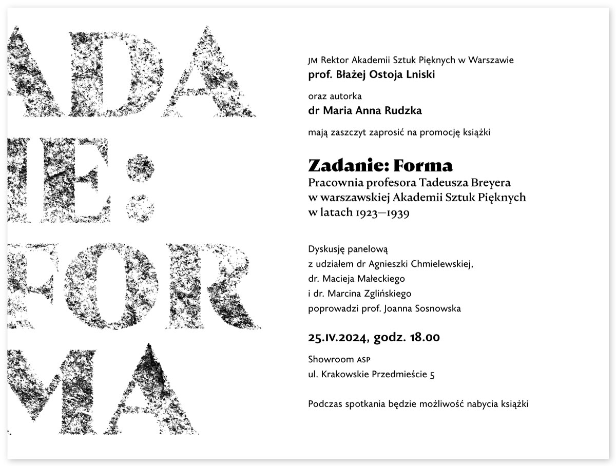 Promocja książki dr Marii Anny Rudzkiej „Zadanie: Forma. Pracownia profesora Tadeusza Breyera w warszawskiej Akademii Sztuk Pięknych w latach 1923–1939” i dyskusja panelowa